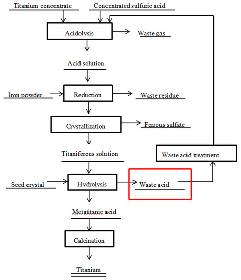 Titanium dioxide, as an important white inorganic pigment, is produced by chlorination and sulfuric acid decomposition. In China, 95% of titanium dioxide is produced by the sulfuric acid decomposition method due to the low grade of titanium resources and the easy operation. The process route is shown in Figure 1 [1,2]. However, a large amount of waste acid will be produced in the hydrolysis process for preparing titanium dioxide. Generally, 8–10 tons of waste acid will be produced in the production of 1 t of titanium dioxide, 25–35% of which will be reused, and the actual discharged waste acid is 6–6.5 tons. According to the current capacity of titanium dioxide in China, the waste acid discharged each year amounts to millions of tons [3].