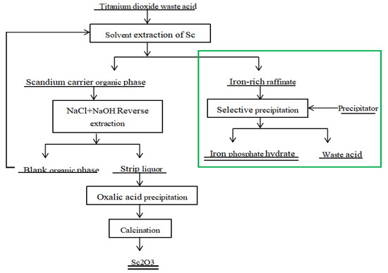 Based on this, our research team proposed a new method for the step extraction of valuable components from titanium dioxide waste acid. Additionally, related patents have been applied [7,8,9]. First, the trace scandium in titanium dioxide waste acid is selectively extracted by the solvent extraction method [10]. Furthermore, raffinate containing divalent iron can be used to prepare iron phosphate or doped iron phosphate precursor by adding a precipitant containing phosphorus, which is the research content of this paper. Then, the acid resource in the waste acid can be used in the acidic leaching process of minerals to realize the comprehensive utilization of acid resources [11,12].