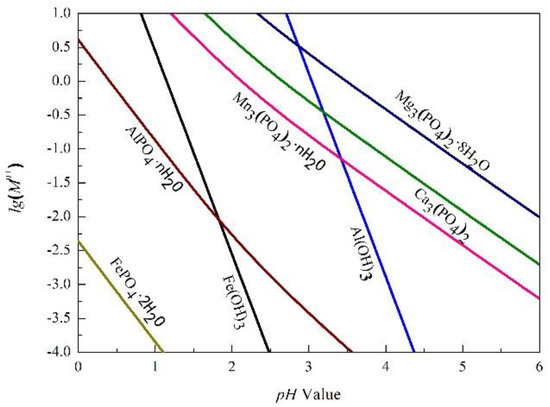 According to Figure 3, the precipitation sequence of orthophosphate is FePO4·2H2O, AlPO4·nH2O, Mn3(PO4)2·nH2O, Ca3(PO4)2, and Mg3(PO4)2·8H2O. Meanwhile, the precipitation sequence of hydroxides is Fe(OH)3, Al(OH)3, Mn(OH)2, Mg(OH)2, and Ca(OH)2.