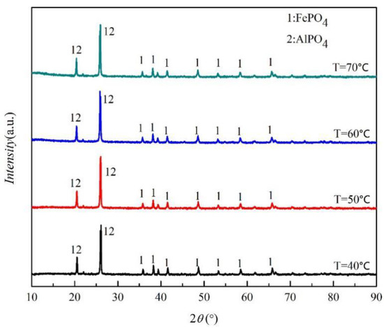 In Figure 5, when the reaction temperature is 40–70 °C, the precipitate obtained is mainly iron phosphate, and only a small amount of aluminum forms aluminum phosphate, which is consistent with the results of the thermodynamic analysis. Meanwhile, with the gradual increase of the precipitation temperature, the crystal form and peak strength base of FePO4 after calcination are not affected, and the crystal form of the product is hexagonal after analysis.