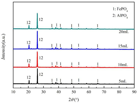 In Figure 9, the precipitate phase is still dominated by iron phosphate, with a small amount of AlPO4 when the molar ratio of P/Fe ranges from 1 to 1.4. Additionally, with the increase of the molar ratio, the peak strength of the product decreases accordingly.