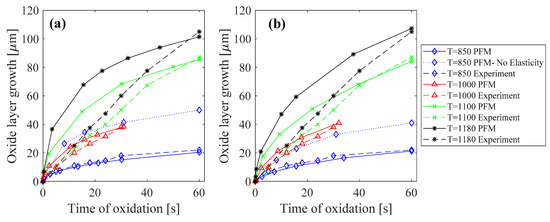 Oxide layer growth at different temperatures (°C) for a diffusive interface thickness of (a) and (b) . Experimental results are obtained from [31].