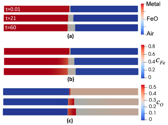 Figure 2 shows the evolution of metal, oxide, air phases, and the corresponding concentrations with respect to their initial condition at the isothermal oxidation temperature of 850 °C. It is evident that the outward oxidation is dominant. Following the concentration evolution of Fe (Figure 2b), the concentration at metal/oxide interface dropped from at t = 0 s to the at t = 60 s, accounting for the migration of Fe atoms from the metal phase to oxide phase. Likewise, for the evolution of oxygen concentration, Figure 2c shows the reduction from to at the oxide/air interface due to the consumption of oxygen to form the oxide. This is one of the advantages of this model since the duration of oxidation can be controlled by adjusting the difference between the initial oxidant concentration and its equilibrium value.