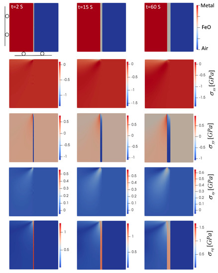 At the metal/oxide interface near the upper free edge in Figure 3, the expansion of oxide in the y-direction on one side and the prevention of movement in the x-direction by metal on the other side create a local counterclockwise bending of the metal/oxide interface. This causes the metal phase to experience a highly localized compressive stress in the x-direction. The trend of stress evolution shows that as the oxide layer evolves, the force it applies on the metal phase increases, hence the generated stresses increase. Looking at the stress maps in Figure 3, these incremental increases in stresses were more noticeable. According to the stress maps, two critical regions could be detected. The first is the metal/oxide interface at the top edge, which shows the maximum equivalent (von Mises) () and the maximum shear stress (). Additionally, maximum compressive () and tensile () normal stresses were observable at this region. In addition, the other criterion that makes this region critical is the transition between compression and tension in the normal stresses. Since the strength is usually lower at the interface of two phases, this region is susceptible to failure and delamination/separation of oxide from the metal substrate may occur. The other critical region that is at risk of failure is at the bottom edge of the oxide phase, which experiences the maximum compressive normal stress as well as high levels of von Mises stress. Since this compressive stress acts on a plane parallel to the oxide/metal interface and perpendicular to the oxide growth direction, any small surface irregularities can initiate spalling and buckling of the oxide scale [19].