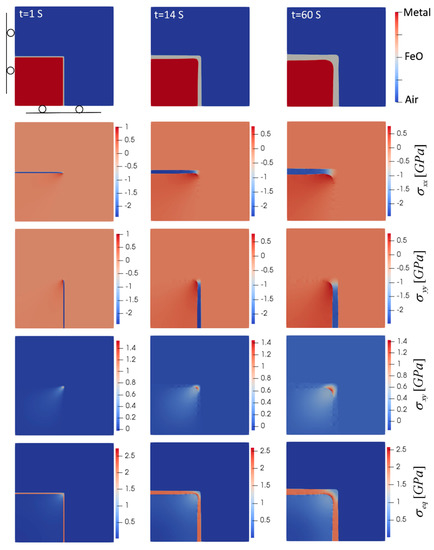 Oxide layer growth and evolution of induced stresses for the oxidation of a sharp corner (T = 850 °C). Domain size is 0.5 mm × 0.5 mm.