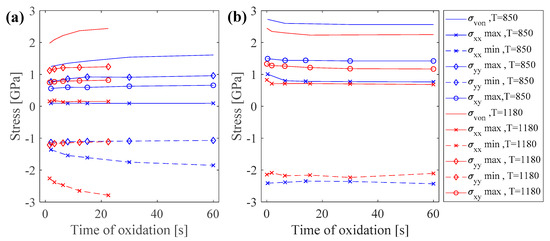 The effect of increasing the oxidation temperature on oxide growth and the induced stresses was considered by repeating the simulation for 1180 °C. It is expected that increasing the temperature increases the oxidation kinetics, thus thicker oxide layers form. The results showed that elevating the temperature did not change the pattern of stress distribution and stress states, and the maximum and minimum stresses occurred at the same regions as in the lower oxidation temperature of 850 °C. The trend of increasing or decreasing of stress versus time also remained unchanged for both planar and sharp corner oxidation. However, the stress values varied as the temperature increased. For the purpose of comparison, variations of the extremum values of stresses are presented in Figure 5, for both planar and sharp corner oxidation.