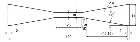 Dimensions (in mm) and shape of the flat dog-bone specimen for fatigue testing.