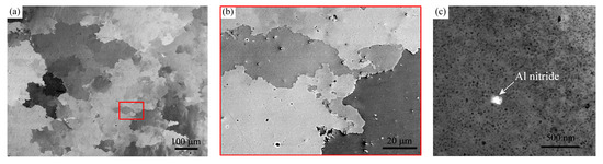 The microstructure of the material under investigation is shown in Figure 2. There were no changes observed in the microstructure before and after the termination of the fatigue test at 800 °C. The material had a non-uniform fine to coarse-grained structure (see overview in Figure 2a). The grain size varied from approximately 20 μm to nearly 300 μm. The average grain size evaluated on approximately 500 grains using the linear interception method was 129 μm. The grain boundaries were strongly wrinkled (see Figure 2b). The particles with a size up to 1 μm observed on the metallographic cross section (see spots in Figure 2b) and TEM foil (Figure 2c) were analyzed by EDX and evaluated as Al nitrides. In the presented study, neither the SEM nor TEM investigations provided any evidence of the detrimental effect of Al nitrides on the fatigue behavior of the investigated ODS alloy. The nitrides stemmed from the nitrogen involved in the Fe powder used for the production of the ODS powder by mechanical alloying. The Al nitrides coarsened significantly during secondary recrystallization, where one could appreciate the drastic difference between the coarsening kinetics of AlN and Y2O3 precipitates.