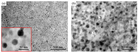 The internal microstructure of the new-generation ODS alloy after fatigue loading was studied using TEM (see Figure 3) in scanning mode. Figure 3a shows an overview of the microstructure with a high quantity of nano-particles of spherical shape homogeneously distributed in the material (detail of nano-sized yttrium particles with the size of approximately 25 nm in the inlet in the left corner). The amount of Y2O3 nanoparticles was significantly higher than that reported in the literature because of the presence of 4 wt.% of Y2O3 compared to the typical 0.25 wt.% for previously reported ODS steels [1,2]. Figure 3b shows a microstructure after fatigue loading (incremental step test) in higher magnification where reinforcing yttrium nanoparticles were present together with dislocations (marked by white arrows). Dislocations were observed with the electron beam vector parallel to the [010] zone axis. This indicates that the dislocation structure of the density to the order of magnitude 1014 m−2 developed in the grains during the fatigue experiment.