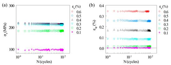 During fatigue loading, the individual levels of total strain amplitude were increased from 0.1% to 0.6%. The number of cycles in the block for each strain level was set to 100. The recorded stress amplitude was then plotted in the dependence on the applied number of cycles (see Figure 5a). At the last level of stress amplitude (i.e., at the stress for the strain amplitude εa = 0.6%), the number of cycles to fracture reached the value of 84. Fatigue loading at 800 °C resulted in a stable stress response in all tested strain levels (i.e., neither hardening nor softening was observed), and therefore according to [17], the final data points can be used for the construction of the CSSC. The same character of fatigue response (i.e., neither hardening nor softening) was observed when the plastic strain amplitude εap was evaluated from the saturated hysteresis loops. These data are plotted in the dependence on the number of applied cycles (see Figure 5b).