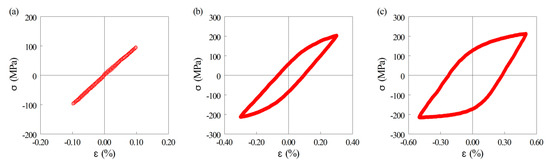 Saturated hysteresis loops for three different applied strain amplitudes: (a) εa = 0.1%; (b) εa = 0.3%; (c) εa = 0.6%.