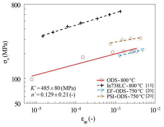 In order to compare the studied new-generation ODS alloy with other ODS steels, CSSCs determined for two types of ODS material (i.e., ODS Eurofer (EF-ODS), tempered ferritic–martensitic steel and ODS ferritic steel (PSI–ODS) presented by Kuběna [20]) were incorporated into the plot in Figure 7. The CSSC of ferritic–martensitic steel (EF–ODS) shifted to lower stress amplitudes than the CSSC of the ODS material under investigation, but the vice versa was true for ferritic steel (PSI–ODS). Both dependencies published in [20] were nevertheless obtained at the test temperature of 750 °C. If the difference of testing temperature had been taken into account, we can expect that the new-generation ODS alloy investigated in this paper may have comparable or even better properties than EF–ODS and PSI–ODS.