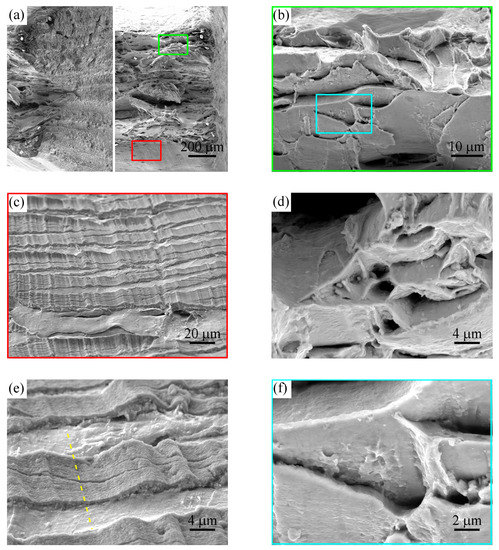 The fracture surface of the sample loaded using the incremental step test where the fracture occurred after 84 cycles at the highest level of strain amplitude (εa = 0.6%): (a) overview in macroscopic scale; (b) tongue like features; (c,e) lower and higher magnification micrograph of a wavy pattern of the oxide layer on the surface of gauge length near the fracture surface; (d,f) ductile dimples between the V-shaped troughs.