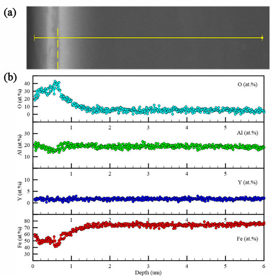 The yellow dashed line in Figure 8e indicates the place from which the metallographic section was prepared and where the chemical analysis of the oxide layer created on the surface was performed. The results of this line analysis presented in Figure 9 indicate that the surface was oxidized up to the depth of approximately 0.5 μm and was formed by mixed Al–Y oxides because a rather significant depletion of Fe was observed in the oxide layer.