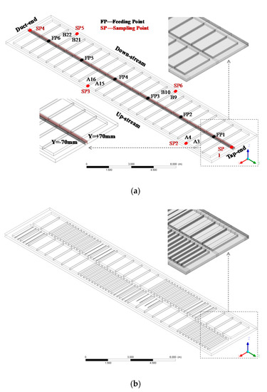Schematic diagram of geometry, feeding points, and sampling points in a typical unslotted Hall–Héroult reduction cell. (a) Unslotted case and (b) slotted case.
