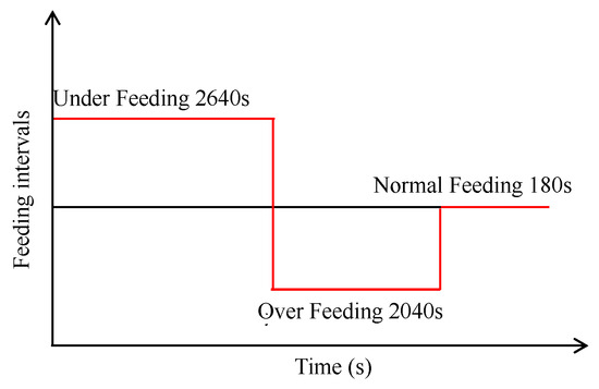 A typical overfeeding and underfeeding cycle of the 500 kA electrolytic cell is shown in Figure 2, including 49 shots in underfeeding, 57 shots in overfeeding, and 4 shots in normal feeding. The alumina feeding was defined as a source term in specified locations. The alumina consumption was defined as a sink term in the ACD region, with the rate was obtained according to Faraday’s law and current density. In addition to the bath flow, the alumina transmission was also determined by diffusion of which the coefficient was 1.5 × 10−9 m2/s from [23].