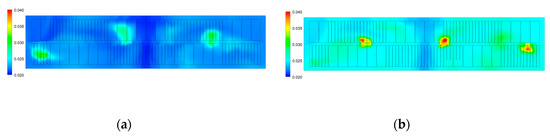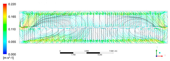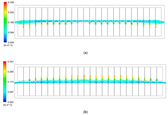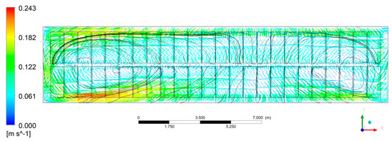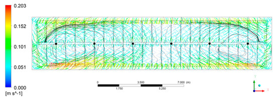 Figure 11 shows the velocity vectors of the bath flow in the middle horizontal plane of the ACD under busbar design A (busbar net A of Case 2). Comparing with Figure 3 of busbar design B (busbar net B of Case 0), it can be seen that the bath flow also exhibits two sizes of vortices, but the symmetry of the two vortices is not as obvious as that of the busbar net B. The velocity distribution in the center of the vortex is also more uneven than that of Figure 3. The maximum bath velocity in the middle plane of busbar net A is 24.3 cm/s, and the average velocity is about 7.76 cm/s. After the busbar structure is upgraded from A to B, the maximum flow velocity in the ACD plane is significantly reduced, especially at the ends of the reduction cell.