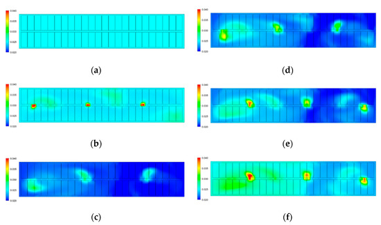 Alumina distribution in the horizontal plane in the middle of the ACD for the unslotted case 0: (a) t = 0 s, (b) t = 60 s, (c) t = 2700 s, (d) t = 3180 s, (e) t = 3420 s, (f) t = 4860 s.