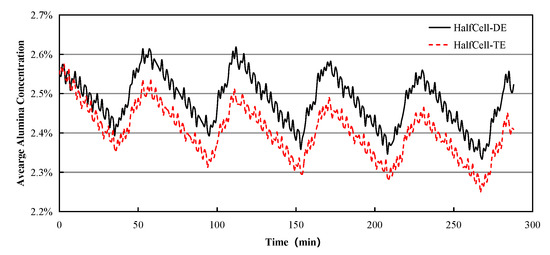 Figure 6 shows the change trend of average concentration of alumina in the duct end half-cell (left half-cell) and the tap end half-cell (right half-cell) during five underfeeding and overfeeding cycles. The two curves in the first cycle do not reach stable state, and gradually stabilize after the second cycle. In the last three cycles, the average alumina concentration of the half-cell at the duct end is 2.41%, and the average concentration of the half-cell at tap end is 2.32%. This might involve the bath flow characteristics in the ACD and the locations of feeding points shown in Figure 3.