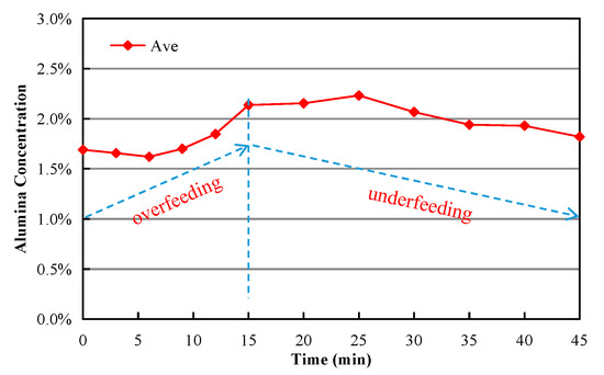 The distribution of the alumina concentration is controlled by three steps: feeding, consuming, and transmission. Two combinations of feeding points FP1-FP3-FP5 and FP2-FP4-FP6 were alternately fed in sequence by a feeding dose of each combination 3.6 kg (1.2 kg × 3) here.