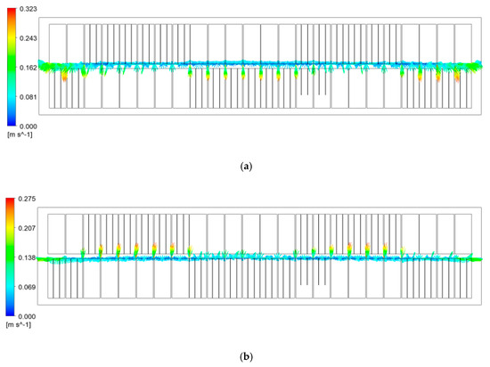 Bath flow in vertical planes in the slotted case 1: (a) Y = +70 mm and (b) Y = −70 mm plane.