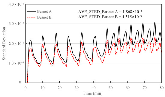Since the alumina concentration changing with time for busbar net A is similar with that of busbar net B in Figure 5, a no more detailed description is needed here. Figure 12 shows the tendency of standard deviation of alumina concentration in the underfeeding and overfeeding cycle. Both curves present saw-tooth patterns, which are closely consistent with the alumina concentration in Figure 5. The average value of the standard deviation decreases from 0.001868 for busbar net A to 0.001515 for busbar net B, which is about a 18.9% reduction. This indicates that busbar net B makes the alumina concentration more uniform within the bath.