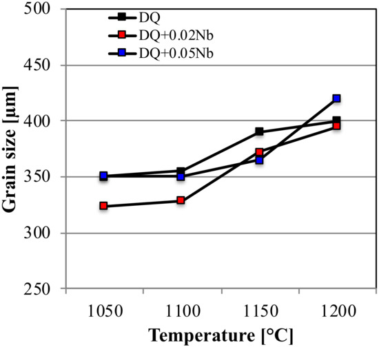 - Ogino, Y.; Tanida, H.; Kitaura, M.; Adachi, A. Effect of Niobium Addition on Austenite Grain Size in Steels. Tetsu to Hagane 1971, 57, 533–546. [Google Scholar] [CrossRef]