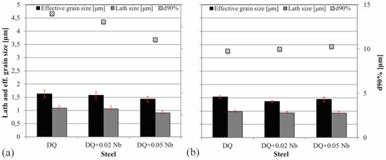 - The microstructures of direct quenched samples consisted of lath martensite and some lower bainite. Smaller lath and effective grain sizes were achieved with higher Nb content and the lower finish rolling temperature of 820 °C. Nb alloying also increased the amount of low-angle boundaries in the microstructure.