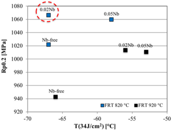 - Nb microalloying leads to improved strength in these steels. The greatest effect of Nb on strength was observed at the higher FRT of 920 °C, where the effect of Nb on austenite pancaking was strongest. When low FRT was used (820 °C), high strengths were achieved even in the case of Nb-free steel and the effect of Nb was smaller. Addition of 0.02 wt.% of niobium combined with low FRT produced the overall best mechanical properties and can be considered to be in high level compared to steels with similar strength class.