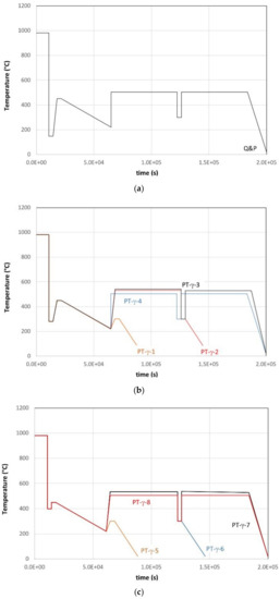 (a) Heat-treatment cycle as performed on Q & P specimen; (b) heat-treatment cycle as performed on specimens from PT-γ-1 to PT-γ-4; (c) heat-treatment cycle as performed on specimens from PT-γ-5 to PT-γ-8.