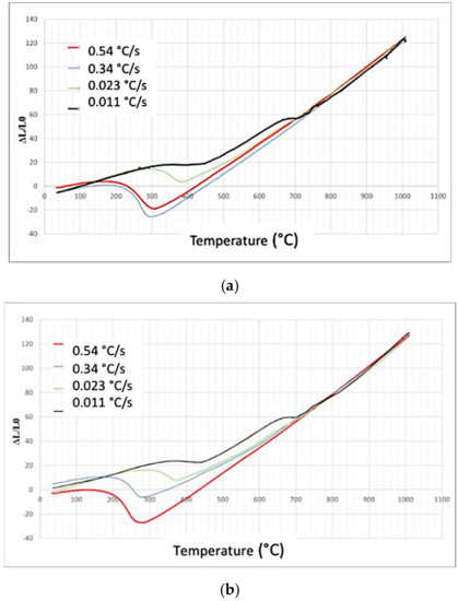 Dilatometric curves of the considered steel: (a) austenitization at 980 °C; (b) austenitization at 1200 °C.