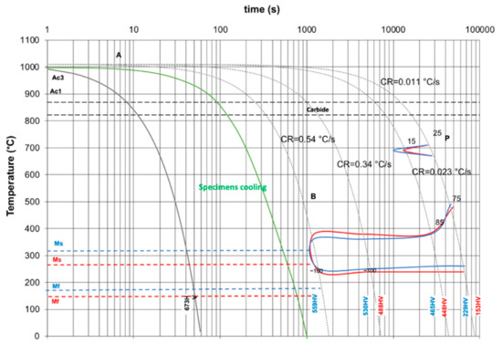 CCT diagrams of the considered steel (austenitization at 980 °C, blue curve; austenitization at 1200 °C, red curve). Green cooling curve: first cooling undergone by all specimens reported in Table 2.