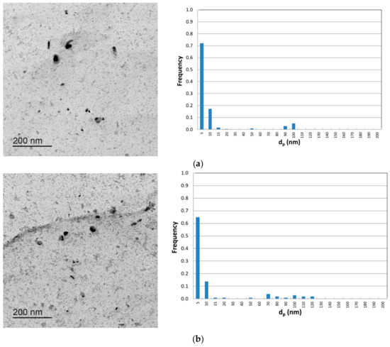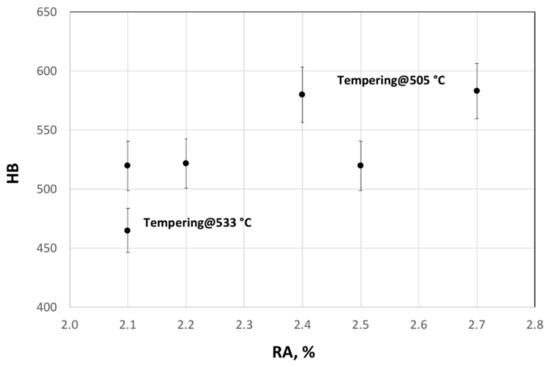 In fact, a very fine precipitation is detected in specimens PT-γ-3 and PT-γ-7 (average precipitation diameter dp = 14.6 nm and dp = 16.4 nm, respectively), as shown in Figure 8. Such precipitates were not detected in the other specimens. Finest precipitates (dp < 10 nm) were identified to be chromium carbides vanadium rich. Vanadium presence was not detected in coarser precipitates. The crystallographic lattice parameters’ measurements obtained by diffraction patterns analysis allowed us to identify precipitates ranging dp < 5 nm as MC, precipitates ranging 5–10 nm as M2C. The largest precipitates were classified as M23C6 (ranging 70–200 nm) and M3C in the case of (dp > 200 nm). The Brinell hardness HB dependence on retained austenite content is reported in Figure 9. Results show that higher hardness values are found in the case of higher-retained-austenite-content specimens (hence lower tempering temperature). Results suggest therefore that the presence of retained austenite, also in a small amount, should exert a non-negligible effect. This means that manufacturers are called for a specific heat-treatment design, depending on the final properties required for different forged components.