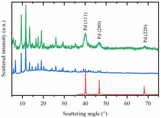 Ex situ XRPD patterns (Cu Kα radiation) for metallic palladium (red), HKUST-1 (blue) and Pd@HKUST-1 sample (green).