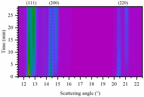 After complete formation of β-hydride phase, the sample was outgassed by opening the electrovalve to the vacuum pump, and the continuous collection of XRPD data with time resolution of ca. 5 s was started. The quality of the data can be appreciated in the Figure S2 of the Supporting Information. The evolution of XRPD profiles is illustrated in Figure 4. The hydrogen desorption from the particles is accompanied by a gradual decrease of the peaks of β-hydride phase (highlighted by dashed vertical lines in Figure 4) with the cell parameter ca. 4.03 Å to α-hydride phase highlighted by dotted vertical lines (cell parameter ca. 3.90 Å).