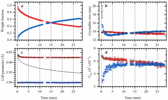 Fractions (a), crystallite sizes (b), cell parameters (c) and Uiso values (d) for α- (blue circles) and β- (red squares) hydride phases of palladium as function of time after fast outgassing from 2.1 bar hydrogen to vacuum at 80 °C obtained by Rietveld refinement of XRPD data.