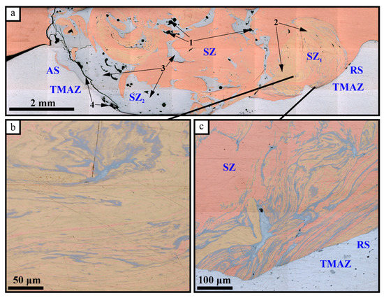 The macrostructure view of the FSW seam cross-sectional area allows us to observe composite structures in both the stirring zone (SZ) and thermomechanically affected zone (TMAZ) (Figure 2a). Both central and bottom areas of the SZ located close to the advancing side of the seam reveal discontinuities which may be shrinkage pores formed during the formation of Cu-Al intermetallics. The stir zone is characterized by alternating Al/Cu layers in its bottom part (Figure 2b) as well as Al-Cu solid solution and intermetallic compound (IMC) layers (Figure 2c). The large IMCs areas are seen on the retreating side of the SZ (Figure 2a).