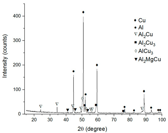 The XRD pattern in Figure 3 reveals the phases as follows: Al, Cu, Al2Cu, Al2Cu3, AlCu3, Al2MgCu and thus suggests that in-situ Al-Cu reactions have occurred. Nevertheless, there are large IMC-free areas composed of unreacted Cu and Al. Formation of Al2Cu IMCs on the Cu/Al interfaces during FSW was noted in the majority of works dedicated to dissimilar FSW [24,25,26,27,29,30].