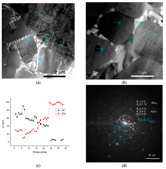 The IMC layers formed at the Al/Cu interfaces on the Cu-rich side of SZ are composed of 2 to 5 μm in size Al2Cu3 and AlCu3 IMCs (Figure 4a,d). The mean size of the Al2Cu3 and AlCu3 particles in these IMCs is about 300 nm. The presence of these phases is confirmed by the results of XRD (Figure 3), TEM (Figure 5) and EDS (Table 2, spectra 4–7).