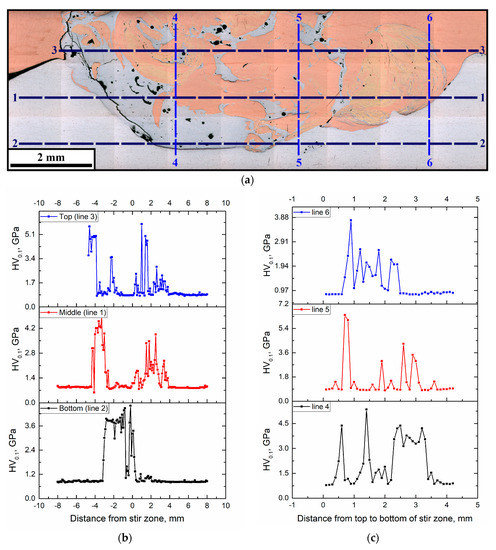 The macroscopic FSP track cross-sectional area in Figure 7a shows lines along which the microhardness number profiles (Figure 7b,c) were obtained. Both Figure 7b and Figure 7c demonstrate that microhardness profiles obtained in two perpendicular directions allow for the differentiation between the matrix and IMCs, and, in fact, reveal the SZ structural inhomogeneity, which means a lack of equality in strength. The microhardness of IMCs is by a factor of 2 to 5 higher than those of the base metals.