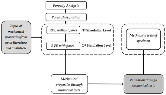 The methodology is displayed in the flowchart shown in Figure 1. The first step of the study has been the characterisation of the samples by involving X-ray diffraction (XRD) imaging procedures. The obtained characterisation of the microstructure and classification of pores were used for the multi-level numerical simulation which accounts for pores characteristics, such as their volume fraction and size. In parallel, compression tests for the validation of the developed numerical model were performed. In the forthcoming sections, the stages of the methodology are described.