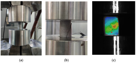 Specimen in the testing machine. (a) before experiment; (b) after experiment; (c) digital image correlation.