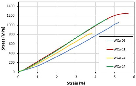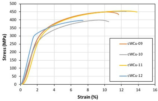 The stress-strain curves obtained for the coarse-grained and the nanocrystalline grain W-Cu type of alloy are presented in Figure 3 and Figure 4, respectively. As shown in Figure 3, the coarse-grained tungsten exhibits a yield stress ranging between 400 and 450 MPa under quasi-static compression conditions at room temperature. The outcomes acquired in this work for the coarse-grained tungsten samples are consistent with results from the literature [19]. In this work, coarse-grained tungsten specimens were found to collapse under tension at a stress level of 450 MPa showing an intergranular fracture and the critical local strain value was found to be equal to 12–14%.