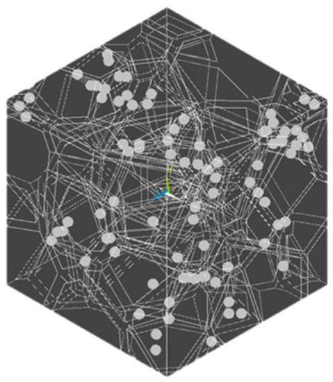 The RVE has a cubic shape. Inside the cube, spherical pores with a diameter of 10 nm were created. The volume fraction of 10.7% was cW-Cu and 9% for W-Cu. The position of pores was random in the grain boundaries’ phase and no overlap between them was allowed. The RVE was meshed with 680.000 elements of ANSYS SOLID 187 element type (ANSYS Inc., Canonsburg, PA, USA) [27] using SMRTSIZE and LESIZE functions so as to guarantee a sufficient mesh size at the grain boundaries. This was a higher-order 3D 10-node element, well suited to model irregular meshes. Such three-dimensional elements provide non-linear elastoplastic, anisotropic features utilizing also large deformations. Each material was defined using the ANSYS multilinear kinematic hardening material model which is suitable for simulating metal plasticity behaviour [27]. The model is fully parametric so as to be easily adapted for each porosity scenario and different compositions of alloying elements. An extensive mesh convergence study, as well as an RVE size effect investigations, was made on the base of the approach proposed in Reference [28,29]. A typical geometry of the porous RVE is shown in Figure 7, while a typical FE mesh is presented in Figure 8.