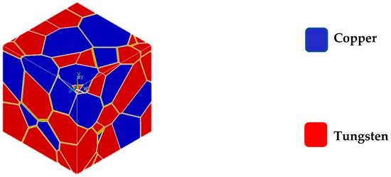 The material properties used in the models of nanocrystalline tungsten-copper system were taken from multilinear stress-strain curves found in the literature [30,31,32,33]. The material properties used in the simulations are presented in Table 4 and they have been assigned to the grain interiors with their nominal composition of 75 wt% tungsten and 25 wt% copper by applying a random distribution. The distribution of tungsten (red-marked) and copper (blue-marked) is shown in Figure 9.