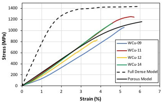 For the case of nanocrystalline W-Cu, the numerical model has been utilised for a tungsten grain size of 110 nm, a copper grain size of 35 nm and volume fractions of W and Cu of 73.7% and 26.3%, respectively. For implementing the maximum strain failure criterion, the critical strain is defined to 6% in accordance with the performed mechanical tests. The computed results by implementing the full dense as well as the porous FE model are shown in Figure 11. As it can be seen, the full dense numerical model predicts a Young’s modulus of 760 GPa and an ultimate compressive strength of 1400 MPa. By accounting for 9% porosity, as measured by the performed experiments, the porous model predicts a Young’s modulus of 230 GPa and an ultimate compressive strength of 1150 MPa. The experimental results for the W-Cu samples show a Young’s modulus of 220 GPa and an ultimate compressive strength ranging between 1100 and 1200 MPa. It is noticeable that the values of UCS and elongation are significantly different. The observed brittleness is largely attributed to the weakening effect of the interstitial impurities and pores along the grain boundaries [15]. Therefore, the ductile-to-brittle transition of tungsten is dependent on the purity level of the material, the volume fraction of grain boundaries, etc. [11]. Tungsten of coarse-grained purity usually exhibits ductile-to-brittle transition above 150 °C [38]. This explains the ceramic-like behaviour of such W at room temperature. In the current methodology, the ductile-to-brittle transition was considered through the implementation of the Wadsworth and Nieh mathematical expression [36] in terms of grain boundary strengthening by reducing the grain size so as to prohibit the global deformation of RVE. The results make it evident that the mechanical behaviour, as well as the property values calculated by use of the Porous FE Model, lie close to the observed experimental behaviour which is not the case when involving the Full Dense Model.