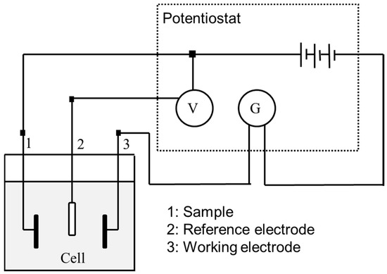 Three-electrode electrical circuit set-up diagram used in electrochemical tests.