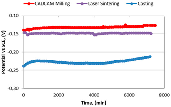 As can be observed from Figure 2, both original and CAD-CAM milled samples showed a similar natural potential around −0.13 V followed by laser sintered samples −0.15 V, while the lowest natural potential around −0.23 V corresponded to the casted samples. The original and CAD-CAM milled samples showed better natural oxidation potential (higher corrosion resistance) than the laser sintered and casted ones, which could be linked to their better chemical homogeneity. Metals higher up in the electro-chemical series (corrosion potential) displace metals lower in the series—which means that when connecting two metals with different potentials, the metal with the lowest potential corrodes [41].