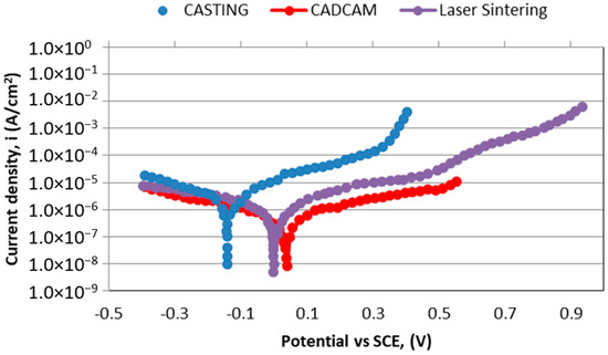 The corrosion potential results showed the best corrosion resistance for the CAD-CAM manufactured samples, as can be observed in the representative potentiodynamic curves presented in Figure 3. The raw material used in the CAD-CAM milling manufacturing process, commonly known as “preforms”, are usually supplied in a solid block form of CoCr alloy. Such preforms are supplied with an excellent chemical and microstructural homogeneity, as a result of a proper annealing thermal pretreatment. In addition, annealing thermal pretreatment avoided the presence of residual stresses in the starting raw material, thereby helping to improve the corrosion resistance of the manufactured components.