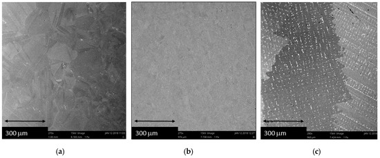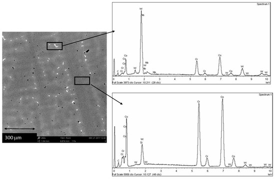 Figure 4 shows different microstructures obtained by the three manufacturing processes used. Figure 4a corresponds to the CAD-CAM milled samples, in which equiaxial grains with twins inside can be observed. This microstructure is typical of the annealed condition without residual stress which favors the corrosion resistance [41,42]. The SEM-micrographs presented in Figure 4b correspond to the laser sintered samples, in which grains without twins may be indicative of the lack of residual stress in samples obtained by this manufacturing method. In general, the absence of twins in the same material is due to the application of stress which produces changes in the sequence of the atomic planes pilling up [44,45,46]. It should be noted that, after additive manufacturing steps, laser sintered samples were subsequently subjected to a stress-relieving thermal treatment. At a higher magnification of this microstructure (Figure 5), rich in Cr, W, and Nb precipitates were revealed. This chemical heterogeneity is more prone to corrosion. The casted samples showed the typical dendritic microstructure produced during the solidification process, as can be seen in Figure 4c. The microstructure of the casted samples showed the presence of a large amount of white precipitates rich in Cr, W, and Nb, which has been observed both at grain boundaries and inside grains. Microstructural analysis also reflected a coarse crystalline grain size in the casted samples, whose grains are represented in a greyscale as a function of their crystallographic orientation.